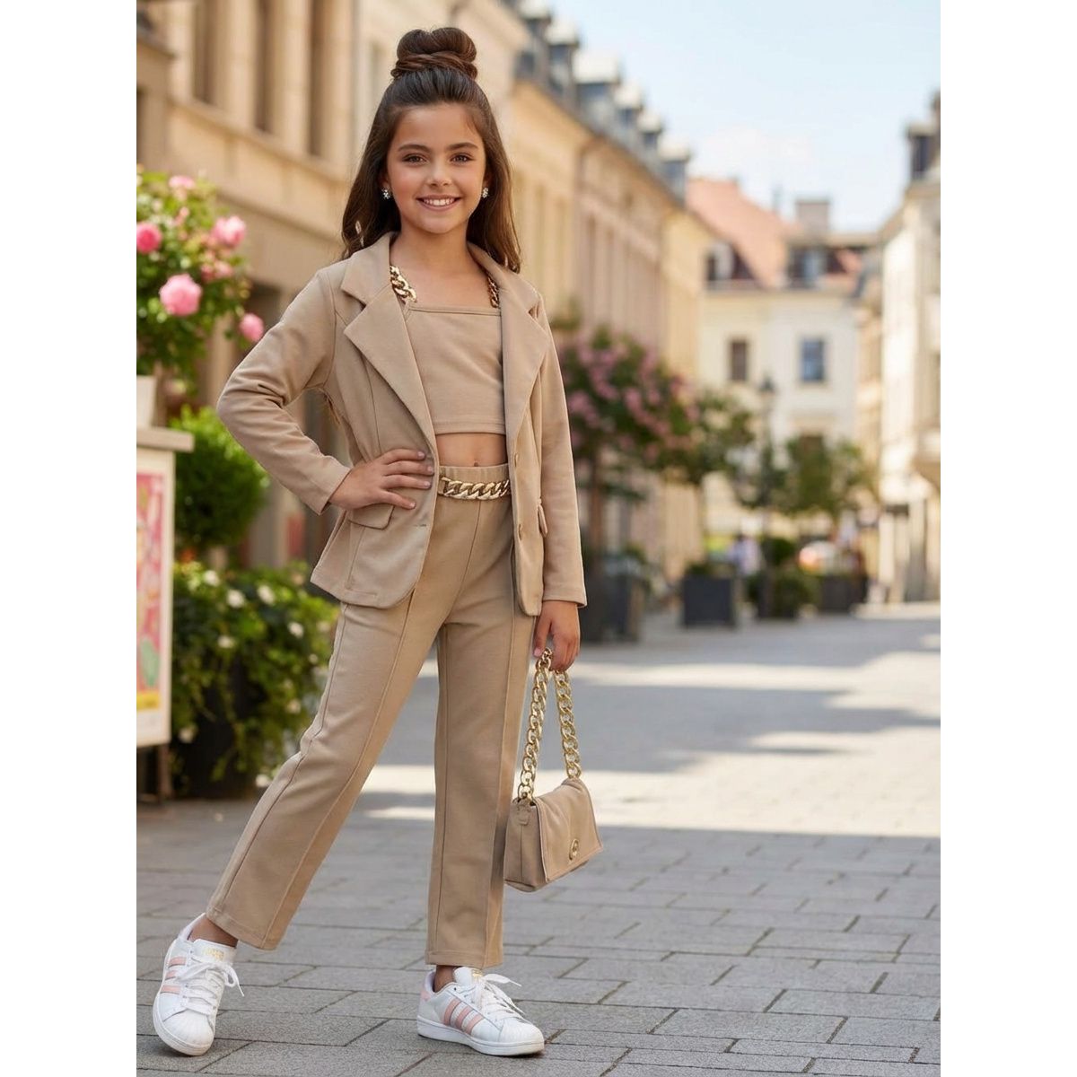 Nádherný dievčenský 4 komplet ,ktorý pozostáva zo saka,nohavíc,topu a kabelky... Dostupný v dvoch trendových farbách červená a béžová... Velkosti sedia klasickému číslovaniu.