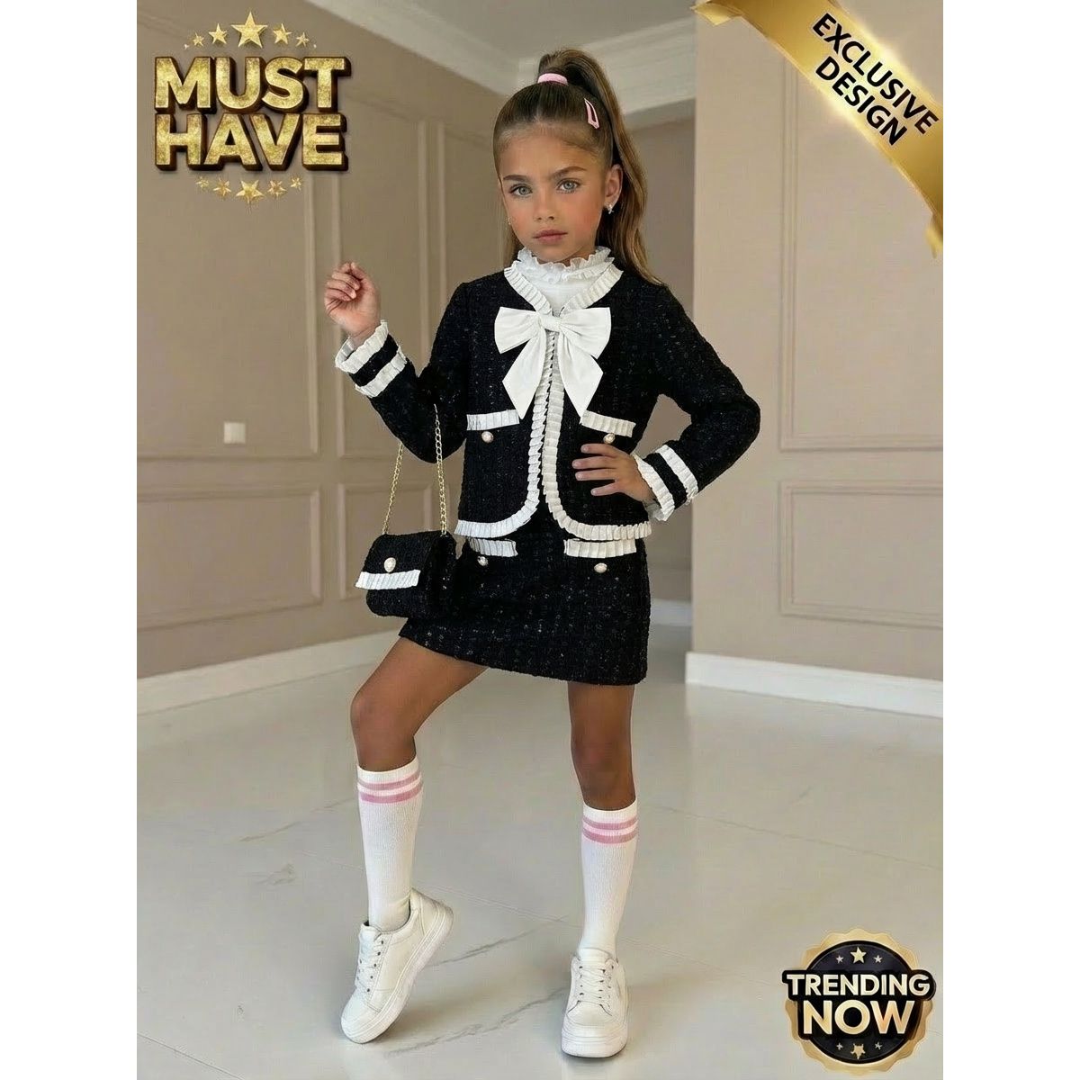 Nádherná NOVINKA,od francúzskej značky Chicaprie,4 dielny komplet ,ktorý pozostáva zo saka,sukne ,trička a kabelky ..TOP MODEL 2026
